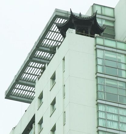 昨日下午,记者来到顺江路粼江峰阁小区。还没进小区,就可从外面看到小区内的几栋白色高楼,一个中式凉亭“屹立”在其中一栋大楼的顶楼露台上,亭角拱翘,在这片现代风格的建筑中,显得十分惹眼。