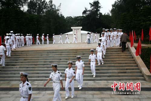 中新网海口4月29日电(付美斌)海南岛解放60周年之际,29日上午,坐落于海口市金牛岭的解放海南岛战役烈士陵园的“解放海南的英烈永垂不朽”纪念碑正式落成,并举行揭幕仪式。渡海作战和琼崖纵队老战士、海南省直机关干部、海南省军区官兵、驻琼武警官兵、海口市部分中小学生1200余人,向纪念碑三鞠躬缅怀先烈。