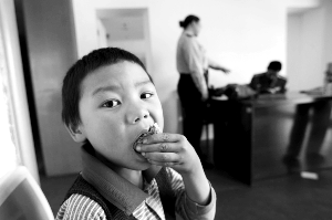 男孩上身穿着毛坎肩,似乎是用大人的衣服改小的,下身的牛仔裤显得异常肥大,裤脚挽了好几道。尽管已经8岁了,但个头只有1.2米,很瘦,大大的眼睛,每当咧嘴笑时,露出一排小豁牙。