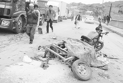 记者在现场看到,一辆金杯面包车翻倒在桥中央,肇事货车侧翻在桥面上,立交桥北边的护栏被撞毁路边到处都是散落的水泥,一些被撞的车辆停靠在路边。
