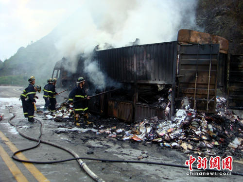 接到报警后,河池金城江消防大队立即出动2台消防车、12名官兵赶赴现场处置。由于事发地点较远,消防官兵赶到现场时,起火车辆的火势已十分猛烈,火焰将整车包围。消防官兵随即展开了扑救。由于火势过猛,且车内满载大量杀虫水、油漆和木板等可燃物,使得灭火用水消耗极大,加之周边无可取水源,灭火过程中,消防官兵只能数次往返数十公里外取水,灭火工作也被迫进入僵局。
