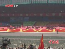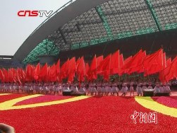 在和谐中国部分,画面上显示胡锦涛主席带领着56个少数民族,在中国的地图上,欢歌载舞,与民同欢,社会的和谐、生活的美好表现得淋漓尽致。