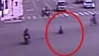 实拍三岁男孩开电动玩具车上马路