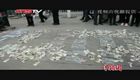 【正文】12月13日,在贵阳市瑞花广场,一名残疾艺人在街边唱歌乞讨,在他前面约两平方的路面上,用粉笔写着几代伟人的丰功伟绩.在这些粉笔字上,撒满了一元、伍角的零钞,周围站满了围观的路人。围观者问他为什么不将钱装着,而是撒在地上,他的回答是说没地方装,就这样很好。