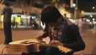 解说:这位坐在深夜街头的小哥与众不同。他将吉他横在腿上,灵动的手指跳跃在琴弦上。把吉他玩成了古筝,引的路人频频回首。听,这是青春的声音,这是舞动的心灵。