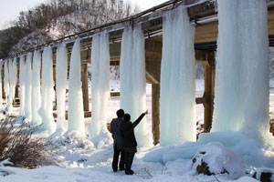 【解说】工人还用泵将污水抽到水库一侧的小树林里,一台抽水装置不断地将污水抽送到罐车上。河道内的污水已经冻成了铁红色的冰,工人将凿开的冰装入麻袋,不知送向何处。污水、污冰、吸附污水的活性炭包最终会如何处理,官方还没有公布相关方案。