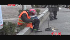 在江西上饶市五三大道一小门口,一位环卫工人坐在地上手着书本看着看着睡着了,正直三九寒天,环卫工人头上戴了一个摩托车的头盔来保暖,脚上穿着一双满是泥泞的单薄鞋子。一个行人走过,惊醒了环卫工人。