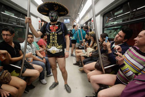 解说:这对环保新人中 新郎叫夏敬伟 家住光谷,新娘谢蝶住在汉口水塔附近。婚礼当天早晨两人手牵手走到 江汉路地铁站,乘地铁过江,一直坐到终点站光谷下车。一路上,亲朋好友簇拥着新人,挤在同一节车厢里,既热闹又充满喜气。大家轮流与漂亮新娘合影,连陌生乘客也献上祝福。