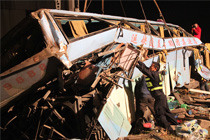 【解说】记者在现场看到,在大桥往江南方向约3.5千米处,防撞栏被撞开了10多米长的口子,外侧护栏已有20多米完全损毁。出事客车车身已严重变形,现场散落着钢管、座椅、玻璃渣、衣物、被子、书籍等,卧铺客车核载36人,事故发生时实载22人。不存在超载的情况。目前事故的原因正在进一步调查当中,到目前还没有公布。