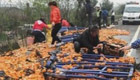 【解说】27日,受大雾影响,京港澳高速公路长潭段近20辆车发生车祸,在一辆侧翻的货车旁,柑橘撒了20多米远。现场有居民拿篓子、桶子在捡柑橘,被高速交警巡逻人员制止。但交警走后,又有上百人从两边护栏缺口排长队爬上高速公路哄抢。