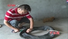 【解说】红白相间的短袖T恤衫、浅蓝色的牛仔裤,加上个性的发型,49岁的谢全国看上去多了几分潮人的味道。他拿出“看家”宝贝:一个直径1米左右“泄了气”的小货车轮胎,一根白色透明的塑料管,一卷绿色胶带,一个瘪的气球。经过一番准备后,谢全国开始展示了他的这项绝技。