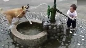 宝宝压井水给狗狗喝 配合“默契”