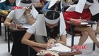 泰国农业大学因为考场太小,学生彼此坐得很靠近,为防止学生在考试作弊,老师竟想出“防作弊帽”,戴在头上白色A4纸遮住双颊,预防有人想四处张望、偷看旁边同学的答案,不少网友看了笑说,“好像要奔丧!”