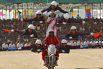【解说】2014年央视马年春晚已进入倒计时,本届春晚虽然少了一些老面孔,但是亮点多多。在第四场彩排中,节目顺序发生了不小变化,基本上可以说是重新洗牌。语言类节目中,蔡明、华少、岳云鹏和大鹏的节目《扰民了您》往前调了两个位置。冯巩的小品《我就是这么个人》也由上半场的前半段挪到了后半段,相应的,曹云金、刘云天的节目《说你什么好》被顺移到了后面。不仅语言类节目顺序变化不小,歌舞类节目的调整也很大,成龙的武术节目《剑心书韵》和黄渤的歌曲《我的要求不算高》都被移到了前面,苏菲玛索和刘欢的歌曲《玫瑰人生》则往后调了调。第四次彩排中,张明敏的《我的中国梦》被移到了零点前,零点后的节目目前仅剩下了两个,一个是张国立的快板《年味儿》,还有就是春晚多年的结束曲《难忘今宵》。