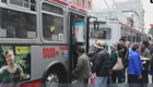 【解说】法律规定,公交车司机不能罢工,对合约不满的司机们就选择集体请病假的方法表达不满。全市的车总站内停满了不运行的公交车,苦了在路边焦急等待乘客。不少人说等车时间超过了1小时,非常不满。吴阿姨在华埠Stockton街上等了两辆45号车,都挤不上去,错过看医生。