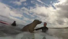 拍客:萌萌小海豹爬上冲浪板求抱抱