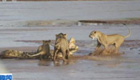 实拍:肯尼亚3只狮子为夺食围攻鳄鱼
