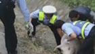 实拍:两头肥猪高速逃脱 七名交警费力捕捉
