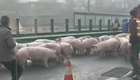 货车侧翻 近百头猪跑上高速路