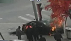 监拍轿车撞上灯杆起火