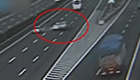 实拍:摩托车速度太快 一头撞上轿车碎片横飞