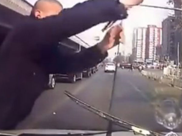 碰瓷男拦车掰雨刮器要钱