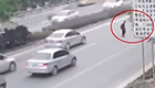女司机驾车出意外 冲出停车场卡在峭壁上