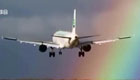 实拍客机绚丽彩虹中降落