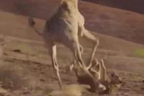 狮子捕食长颈鹿遭猛踹