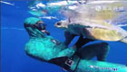 实拍大海龟被绳网缠住 获救后拥抱恩人