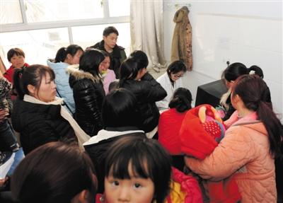 2月22日,在河南省商丘市柘城县人民医院,退休后被返聘的儿科医生张玉芝在坐诊,屋子里面挤满了等待就诊的儿童和家长。新华社记者 冯大鹏 摄