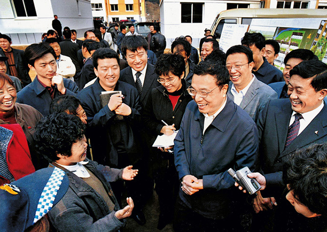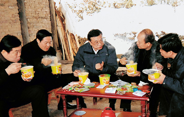2008年1月31日,李克强乘坐装有防滑链的汽车在崎岖覆冰的山路上行进3个小时,来到四川省川北山区宣汉县老君乡紫云村。李克强在察看灾情、慰问群众后,与随行陪同人员边吃方便面边研究救灾工作。新华社记者李学仁摄