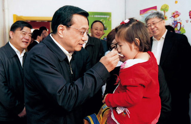 2011年4月25日,李克强参加2011年全国儿童预防接种日活动并考察北京市医改工作。这是李克强在方庄社区卫生服务中心喂孩子服食糖丸。新华社记者黄敬文摄