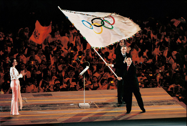2004年8月30日,王岐山在雅典奥运会闭幕式上接过奥运会会旗。新华社发