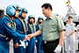 2013年6月11日,中共中央总书记、国家主席、中央军委主席习近平在酒泉卫星发射中心观看神舟十号载人飞船发射。这是习近平向即将出征的航天员聂海胜、张晓光、王亚平挥手致意。新华社记者李学仁摄