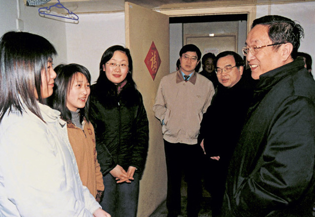 2005年5月16日,俞正声在武汉大学学生宿舍与学生谈心。新华社发