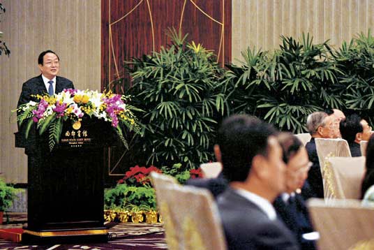 2008年12月20日,俞正声在上海西郊宾馆宴请出席第四届两岸经贸文化论坛的中国国民党主席吴伯雄、荣誉主席连战等嘉宾。这是俞正声在宴会上致辞。新华社记者刘颖摄