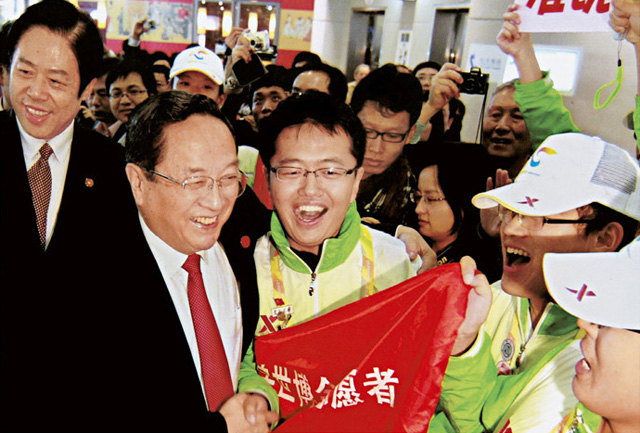 2010年10月31日,俞正声来到上海世博园内的6号门区域看望世博会工作人员,感谢他们的辛勤劳动。新华社记者张明摄