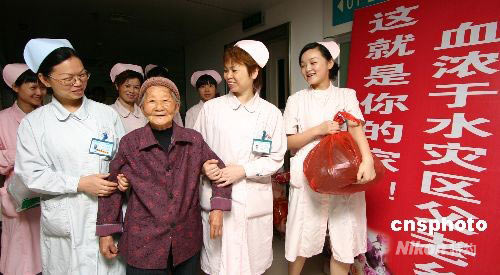 图:地震灾区百岁老人伤愈返家乡