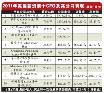 对照中美两国的上市公司高薪榜会发现,中国公司的总经理似乎都很穷:苹果公司CEO 蒂姆·库克(Tim Cook)总薪酬达3.78 亿美元, 甲骨文公司CEO 拉里·埃里森(Larry Ellison) 的薪酬总额为万美元,排名第二。