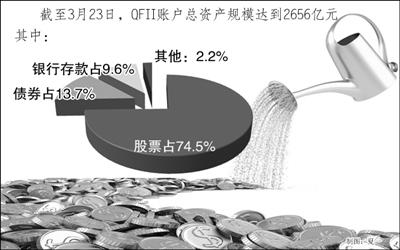 目前,我国已批准了来自23个国家和地区的158家境外机构的QFII资格,其中资产管理公司82家,保险公司11家,主权基金、养老金、捐赠基金等机构29家,商业银行23家,证券公司13家。截至3月23日,QFII账户总资产规模达到2656亿元,其中股票、债券和银行存款占比分别为74.5%、13.7%和9.6%,QFII持股市值约占A股流通市值的1.09%。
