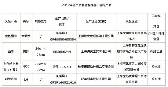 上海质监局公布的2012年毛巾质量监督抽查不合格产品名单显示,大润发素色面巾pH值和纤维含量不合格,受检企业上海大润发有限公司杨浦店;田野面巾纤维含量不合格,受检企业上海易初莲花连锁超市有限公司正大广场店;华兴绣小象面巾(黄)吸水性不合格,受检企业上海闸北南区大润发商贸有限公司;LH割绒毛巾割绒毛巾吸水性不合格,受检企业上海世纪联华超市卢湾有限公司。(中新网证券频道)