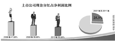 从数据看,A股市场分红股利支付率总体偏低。2001年至2011年上市公司现金分红占净利润的比例仅为25.3%,而国际成熟市场该比例通常在40%左右;在股利分配形式上轻现金股利。之前的三年上市公司现金分红金额占净利润的比例分别为41.69%、35.85%和30.09%。预计2011年度现金分红比例会提高。此外,相当数量的公司未详细披露不进行现金分红的具体原因。