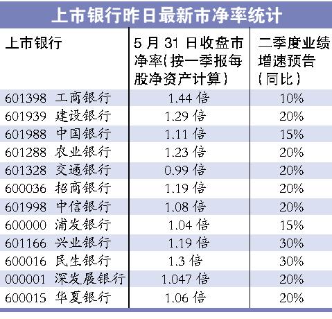 昨日,银行受到新增贷款滑落等消息银行股全线收绿。 按昨日收盘价计算,部分银行股价距离跌破净值只有一步之遥,中国银行(601988)昨日市净率跌至1.11倍。浦发银行(600000)昨日收于8.77元,其昨日收市的市净率为1.04倍。华夏银行昨日则下挫1.1%至9.86元,其市净率也跌至1.047倍。截至昨日,整个银行板块的16只个股市净率均维持在1.01倍至1.5倍之间,平均市盈率约4倍,均处于历史估值低位。