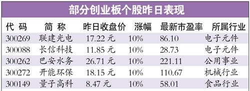 个股方面,逾八成交易个股飘红,联建光、长信科技、巴安水务、量子高科、开能环保五个股票涨停。
