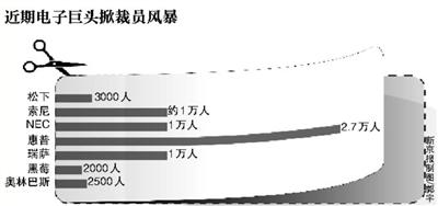 松下日前也被爆出要在2012年内将总部员工减半,裁员人数大致在3000至4000之间。索尼也将于年底在全球裁员10000人,人数达到公司雇员总数的6%。