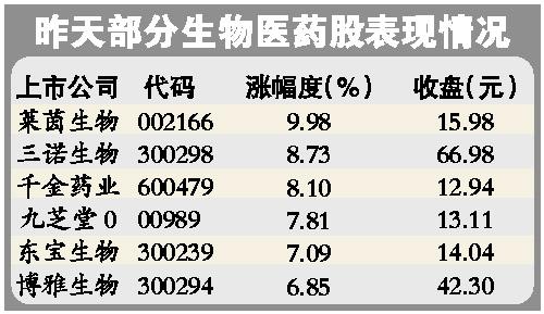 昨天,生物医药指数上涨0.83%,略强于大盘。甲流成北方季节性流感,受此消息影响,莱茵生物低开高走尾盘涨停,带动东宝生物、冠昊生物等生物医药股走强。