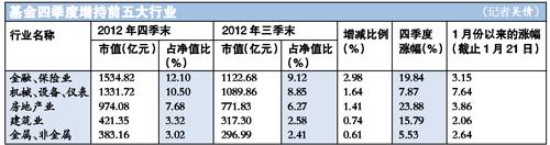 据统计,去年四季度,基金增持幅度排名前三的行业分别为金融保险,机械、设备、仪表和房地产,增仓幅度分别为2.98、1.64和1.41个百分点;减持幅度排名前三的行业分别为食品饮料,信息技术和批发、零售贸易,减持幅度分别为2.58、0.75和0.39个百分点。