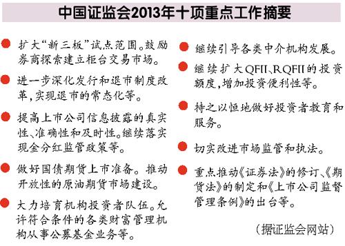 昨日A股市场继续维持高位震荡,沪指全天放量下跌0.56%。记者22日从证监会网站获悉,2013年全国证券期货监管工作会议日前在北京召开。证监会主席郭树清表示,今年将重点从十个方面加强资本市场工作。