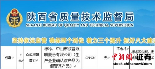 2013年1月22日,陕西质监局发布2012年第四批产品质量监督抽查结果的公告,其中有关浴室电加热器(浴霸)产品质量抽检情况显示,一款标称“中山市欧普照明股份有限公司”的浴霸产品被指标志和说明、接地措施、振动试验不合格。不过,陕西质监局称欧普照明确认该产品为假冒其产品。